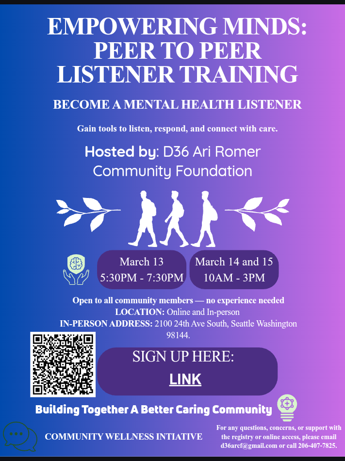 The D36 Ari Romer Community Foundation (www.d36arcfund.us) is committed to building stronger, healthier communities by training Peer-to-Peer Mental Health Listeners each year.